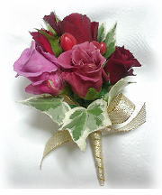 ◆ラウンドブーケ(83) バラ(ファーストレディ・ローテローゼ・マサイ) スプレーバラ(カリエンタ)・ヒペリカム・ ユーカリ ¥24.000 |