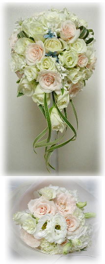 ◆ティアドロップブーケ(40) バラ(ティネケ・シャンパン)・ブルースター ホワイトスター・ミスカンサス・ナルコユリ トスブーケにはトルコキキョウも使用。 ¥25.000 トスブーケ ¥3.000 |