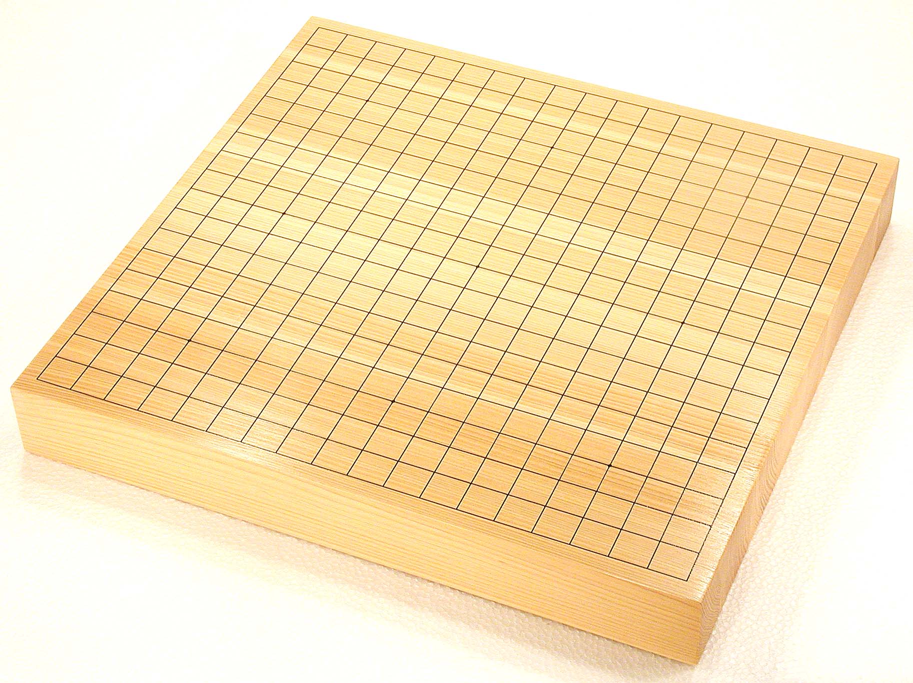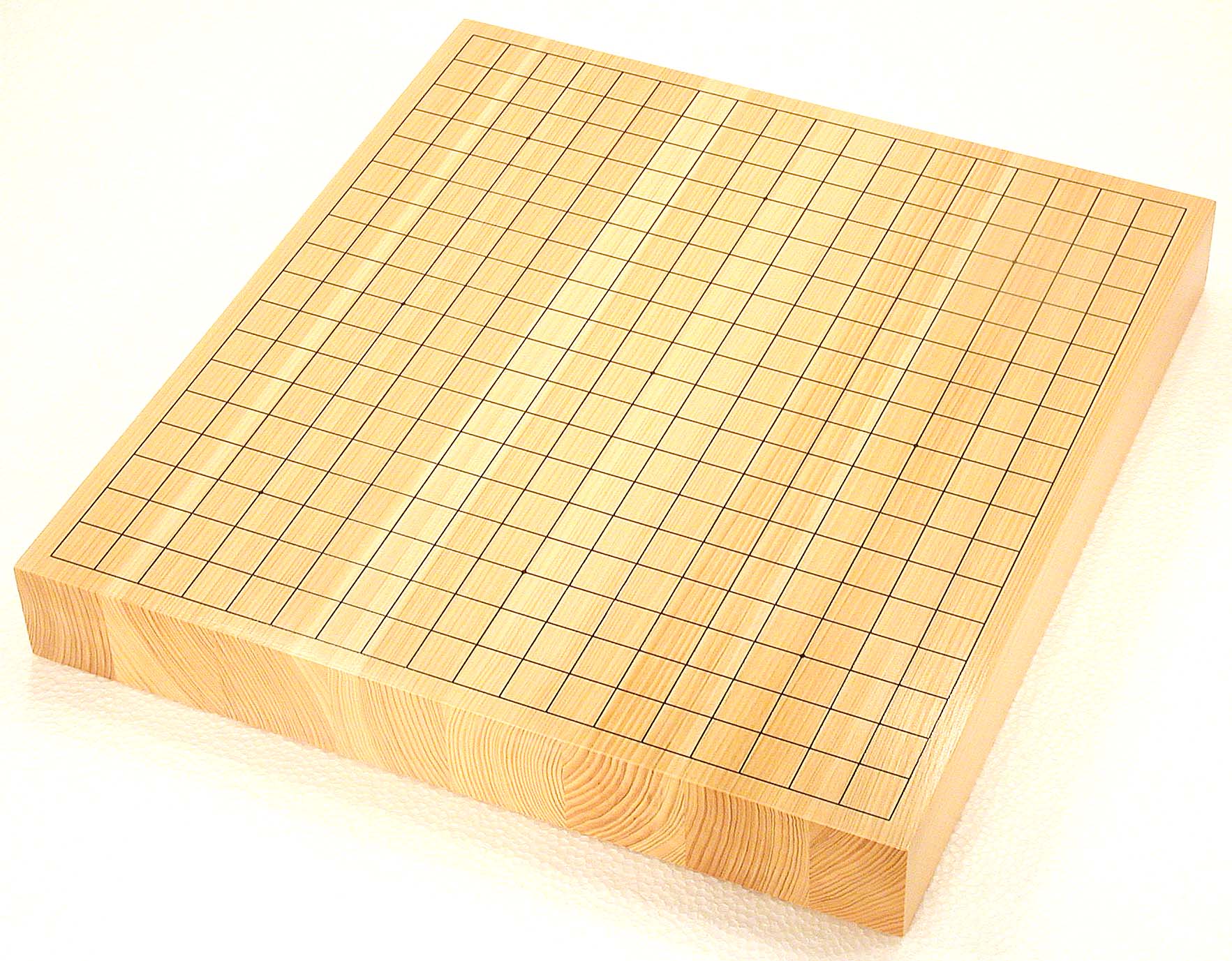 Japanese cypress (HINOKI) Size 2-sun (approx.6cm thick of the board) Note: "SUN" is an old Japanese scale unit. 1sun = approx. 3cm. Wooden boards, one to two inches thick, are commonly used. They are known as "table boards" because they are placed on tables. The wood grain is pleasing to the eye, and the stones make a nice sound when placed firmly on the board. Price: 52,500 JPY |