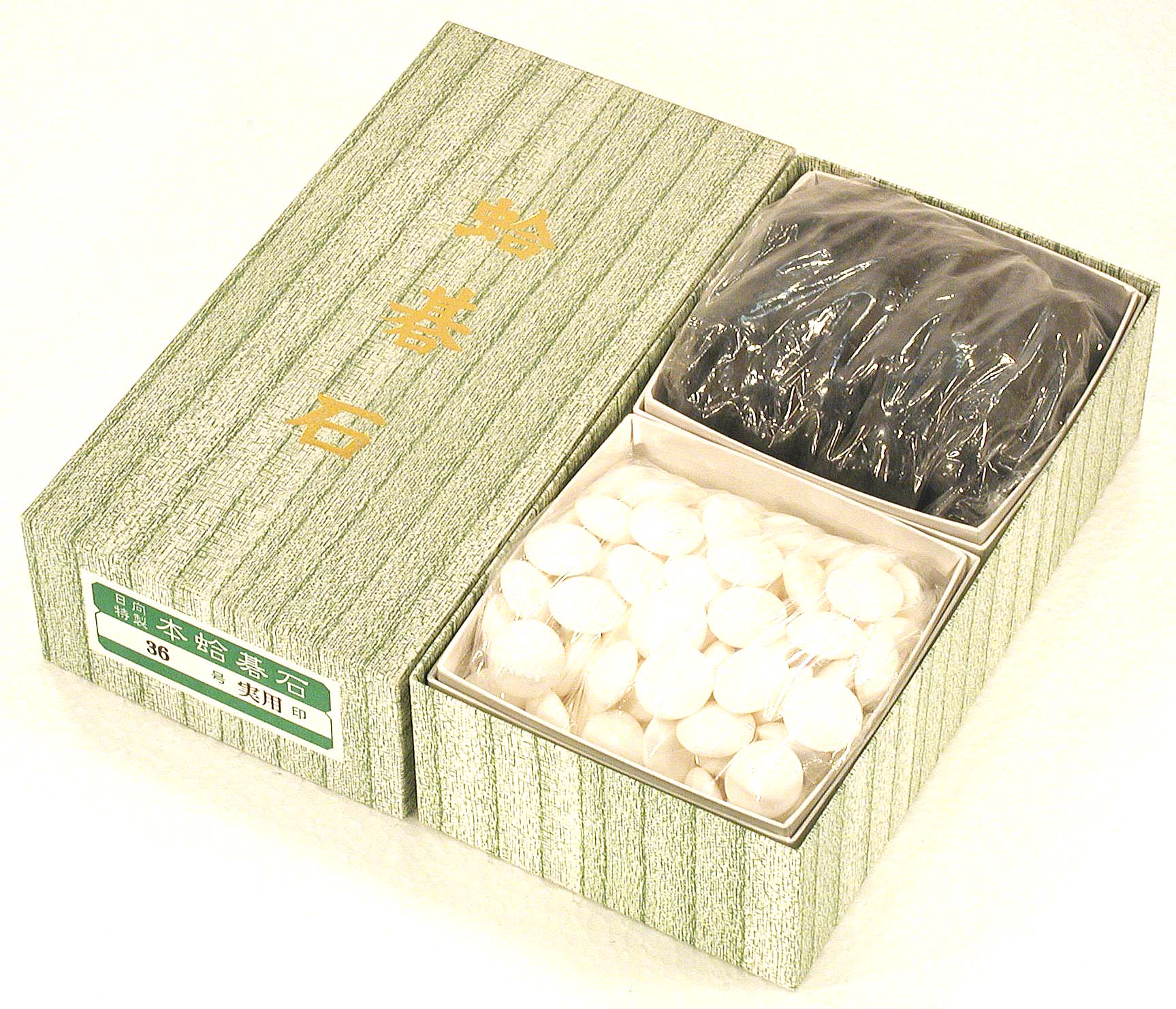 碁石/本蛤(はまぐり)実用印/36号 碁石の白石/厚さは、10,1mmです。 <白石は、メキシコ産の蛤(はまぐり)です/黒石は、那智(なち)石です。> <実用印の白石は、蛤(はまぐり)の縞目(しまめ)がやや荒めです。> ¥75,000(税込み) |