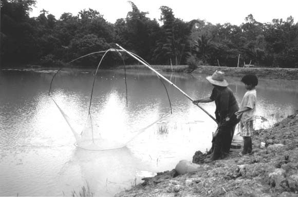 お寺のすぐ脇にある池で魚を獲る親子。