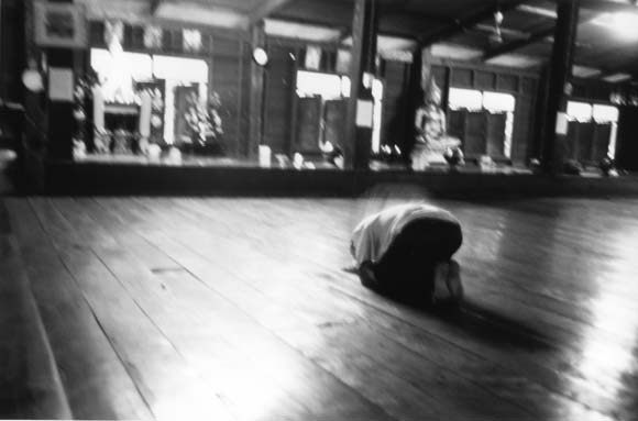 本堂にて、熱心に祈りを捧げる村人。