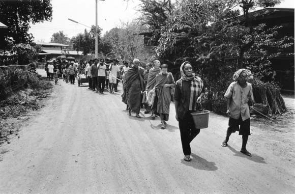 お経が終わると、故人の手に結びつけた長い白い紐を持って、村外れの原っぱに向かう。