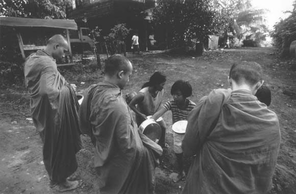 人々はお坊さんが通る時間を知っていて、次々と家から出てくる。