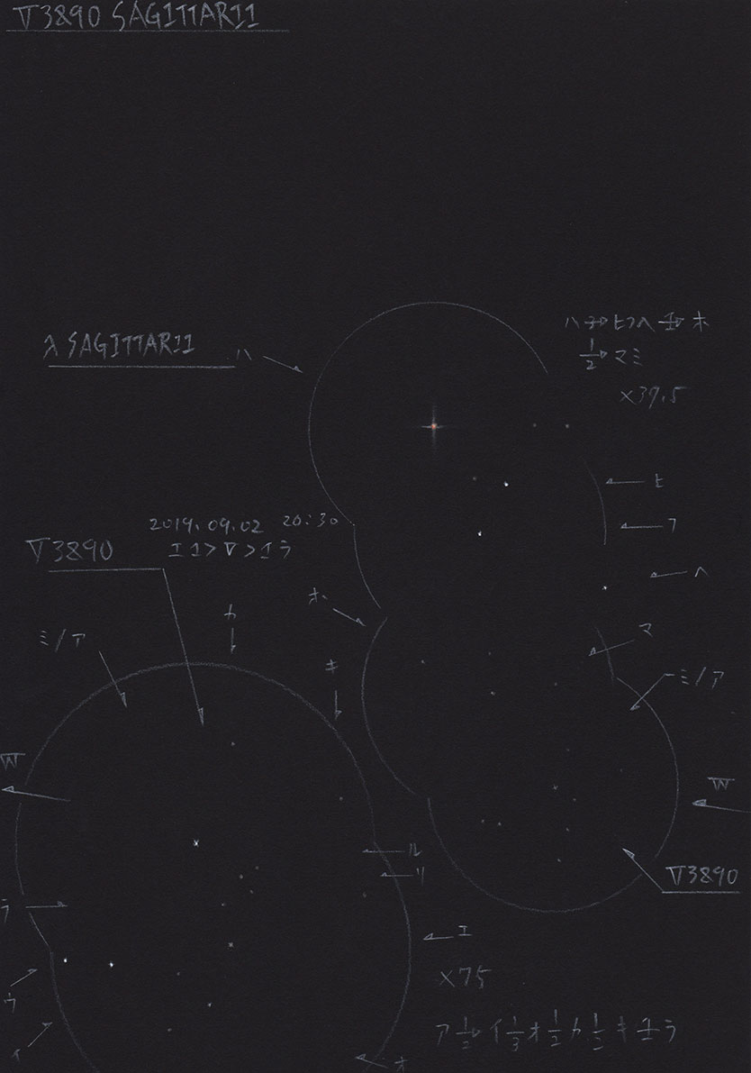右の小さな連なった円は37・5倍の視野を示し、上の明るい星はいて座λ星。V3890は一番下の視野に暗く見えています。左の大きな円は75倍の視野を示し、中央にある星は6等後半ぐらいの星らしい。中央からやや右下にある三星の角のものがV3890 おそらく光度は中央の星より3等ぐらい低い感じ。
