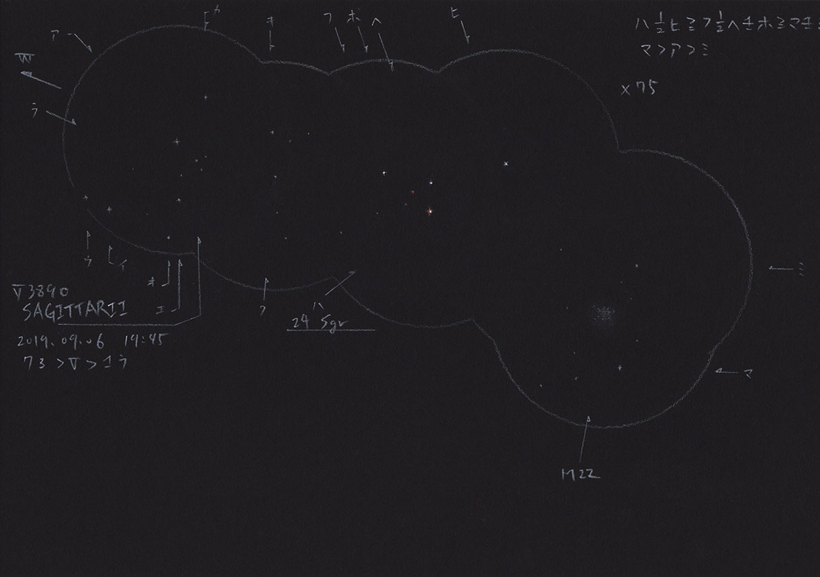 9月6日 17:45 いて座V3890からいて座の球状星団M22までのスケッチ。台風13号レンレンが九州西の海上を北上中で、秋雨前線が日本海にまであがった天気。南の空気が入ったせいか気温は夜になっても30度あまり。空はほぼ快晴だけども半月がさそり座にあって明るく、星は見にくい。とはいえ観察は可能。V3890は2日に比べると多分、1・3等ぐらい暗くなっている(昨晩5日に比べると0・5等か0・3等ぐらい減光)。中央の明るい星は24番星。右側がM22。連なった円は75倍の視野を示します。
