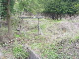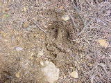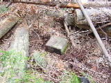 | 上部に近づくと傾斜が緩まります。10年ほど前山火事があったということで,こげた松の大木が立っていました。わらびがあったのも山火事の跡だからかな?やぶこぎという程ではなく快適な?登り。 | 上で,何か動物の気配がしました。足跡がついていました。鹿か,かもしかでしょうか。 | 頂上の近くに石の祠がありました。これが浅間岳神社でしょう。寛政の日付が彫ってありました。麓の鳥居のある木の祠の中にも,江戸時代の板へ書かれたお札があるのをおじいさんに見せていただき,よく腐らずあるなと感心しました。 | 頂上には三等三角点がありました。頂上はかなり平らな地形で,松と雑木が生えています。東の一部杉林です。展望は少しはありましたが,三月頃よりは無いようです。 | また,まっすぐ下山してきて,登り口あたりから,北の方を見た所です。 | 公民館の少し南の道から撮ったものです。上り下りした尾根を見たところ。M先生の話では,北側の尾根を下るとなだらかでよい道で,丁度,余里入口の石碑の所に下れるよいコースがあると後で聞きました。登りもそちら側がいいかもしれないです。 |