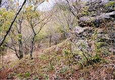 | 家から45分ほど、峠に着いたのは11:15頃。峠は広い空き地があり,車の駐車の心配はありません。つつどりが鳴き、きつつきのドラミングが大きい音で聞こえていました。 | 峠の北側に標識と登りだしに大きな馬頭観音がありましたが,天保という年代が刻まれていました。 | 1449mに登り、西に下って、二ツ石峰の登りになります。道は踏み跡から道になりつつあるくらいで、赤テープなどの印も結構ついています。新緑の木々の足元にはすみれが咲いて気持ちよい登りです。右手木の間に入奈良本牧場あたりが見えます。振り返ると美ヶ原や蓼科山、保福寺峠あたりがよく見えます。登りのコース途中にある石付近。二ツ石峰の登りだけは、結構急です。 | 二ツ石峰1563m山頂部に着くと、入山と二ツ石峰山頂への別方向の標識が立っていました。山頂へ寄り道すると、三角点と丸子町の山岳会のお札?がかかっていました。写真は山頂付近から北を見た所です。縦走路が遥かかなたに続くといった感じです。地図上の水平の直線距離だけで見ると、蝶ケ岳から常念岳を越えて大天井岳まで位。奥穂高岳から槍ヶ岳より長い距離です。 |