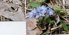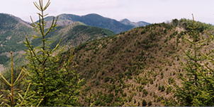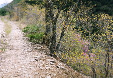 | 二ツ石峰から北へ少し進むと、北アルプスのパノラマが開ける場所です。保福寺峠のウエストン碑あたりよりずっとよく見えますし、縦走路の雰囲気と相まって、まさにトレッキングコースとうなずける場所でした。この日は,こんな感じで、雲間に見える程度でしたが、それも中々良かったです。 | 北側のもう一つの峰から、村境に沿って路が林を切って作ってあり、ぐんぐん下ると林道にでます。少し林道を歩くと、青木村、四賀村との林道の峠の三叉路につきます。以前私は、青木側のゲートからここまで歩いてきて、ここから十観山への縦走に入りました。今は入山へ向かう標識があり,以前は途絶えがちな尾根の踏み跡でしたが、今は道と言ってもいいようなものになっていました。 | 林道では、真中に花も咲き、ぎふちょう(ひめぎふちょう?)が結構飛んでいました。道に止まったので写真に撮れました。三叉路には、青木村の人が3,4人でわらび取りに来ていました。このコース,ずみ(こなし)の木につぼみがたくさんついたものが所々にあり、満開の時は美しいだろうな,と思いました。 | そろそろ帰ろうかと思い、丘のような尾根を、入山手前の1548m地点まで、わらびを取りながらやってきました。1時すぎでした。その辺りから御鷹山を見たところです。ここから引き返しました。ここまで歩いてみて、道は標識がたくさん有りますが,そんなに踏みつけられていない感じで、今後歩く人の多少によって、消え去るか、もっとしっかりした登山道になるか?分かれ道のような気がしました。今日(5月の日曜日)もいわゆる登山者には一人も会いませんでした。(いても行き会う時間ではないかな)そんな人のいない所が本当は魅力かもしれません。 |
