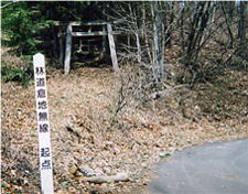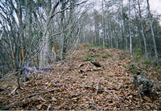 | 余里地区を抜けて,林道倉地無線を入っていきます。起点には山ノ神の鳥居がありました。途中いのしし用と思われる檻などしかけてある所がありました。その付近に車をおき林道を登りました。 | 頂上から東に伸びる尾根まで林道がくると,(途中岩など崩れてそこまで車はいきませんが,)そこから,尾根上に上がります。路肩の斜面には道はありませんが,上に上がると,昔の木馬道のような,一直線に上に突き上げた溝のような道跡が枯葉にうまって続いていて迷う事はありませんでした。上に行くと,だんだん溝状ではなくなりますが尾根上を行きます。 | 山頂部近くにツガの林があり,そこに熊の爪あとと思われるものがついていました。結構新しい爪あとに見えました。 |