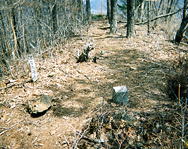 | 車を置いた場所は,標高900mくらいだと思いますが,山頂まで1時間半くらいかかりました。落葉樹がまばらに生え,感じのよい山頂でしたが,木があるため,展望はそれほどよくありません。特に西側はそうです。しかし,東は根子岳,烏帽子,浅間山や,蓼科山が樹間に見え,木がなければ,二等三角点だけのことはあると思わせる展望に思いました。 | 点の記によれば,選点,明治35年5月20日, 昭和53年更新とありました。この標石は明治35年に埋めたものでしょうか。この山が選点された訳は,遠くから見ると,納得します。 | 山頂から,北北東を見たものです。山頂から南北に伸びる尾根には,かなりはっきりした道状になっていました。シーズンにはきのこ取りなどに利用する人が多いのかもしれません。しかし,浅間岳に登った時は主尾根上に道はよく見えなかったので,山頂部の一部だけかもしれません。 |