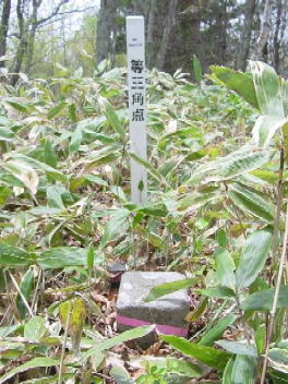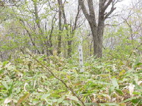 | 頂上付近は,ミズナラやかんば,などの林で,下草は熊笹でした。頂上あたりでカモシカが鳴くような声がして,逃げていったようでした。小さな蝿のようなものが顔のあたりにたくさん寄ってきました。多分動物もけっこう住んでいる場所なのかなと思いました。 | 10時頃,登り出したと思います。頂上に着いたのは,11時15分頃でした。頂上は明るく,落葉樹の新緑がきれいでしたが,展望は何となくしか分かりません。しかし木が無ければ,かなり展望がある感じがしました。二等三角点だから当然かもしれません。 | 二等三角点の標識が簡単に見つかりほっとしました。標石にピンクのテープが巻いてありました。丁度三角点に着いた時,ひめぎふちょうが一匹,付近を飛んでいました。頂上の東側は,下草も無く登り易そうに見えました。地図を見ると東にも林道が通っているので,そちら側からも楽に登れるのかもしれません。 |