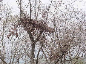 | 真田町入軽井沢からさらに地蔵峠へと進み,釣堀がある所から山の神の鳥居がある横の林道(旧地蔵峠への道らしい)へ入る。ゲートの手前で,右手の林道へ入った。旧植林小屋のあったという草原の上の道はくさりがありましたが,地面におろしてありました。上まで林道を車で行けそうですが,私のは普通の乗用車なので,ゲートあたりに置きました。写真はオコウ山東面と「小池」西面への分岐点(標高1200m)あたり。正面遠くに見える平らな山頂が「小池」。ここからしばらく行き,頂上から西に下る斜面を直登しました。 | 林道からはなれて斜面をしばらく登ると,オコウ山のピークが南西に見えました。まあまあ登り易いカラマツの間伐された斜面(間伐された木はまだ置いたままですが)と落葉樹の林の入り混じった斜面を登っていきました。標高1200m過ぎたこの辺りはまだ芽吹きくらいで明るく,見通しがきき思ったより登り易くほっとしました。 | 熊だながありました。熊が木に登って,手元の木を引き寄せて食べ,お尻にしいて枝がたまったものです。大きい熊だなでした。(まだ見たのは,3,4回しかありませんが)今日も南部熊鈴を付けてきています。 |