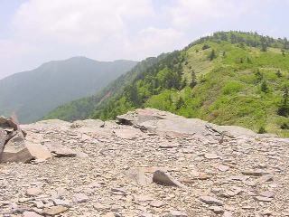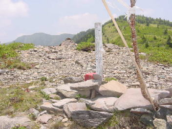 根子岳の一等三角点は,大きい石祠のある山頂(2207m)から北西に下り,少し盛り上がった小根子岳という場所にある。回りに木は無く,三角点が埋められた当時と同じような展望が見られると思います。(2003,6,21)