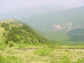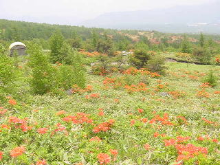 | 西方,菅平の方を見たものです。この日は霞んでいて展望はあまりよくありません。 | 6月末のこの時期,晴れれば,花がたくさん咲いてとても根子岳登山によい季節と感じました。(赤いのはレンゲツツジ、左端は中腹にある避難小屋) | 山頂方面,四阿山(奥の方)を見る。 |