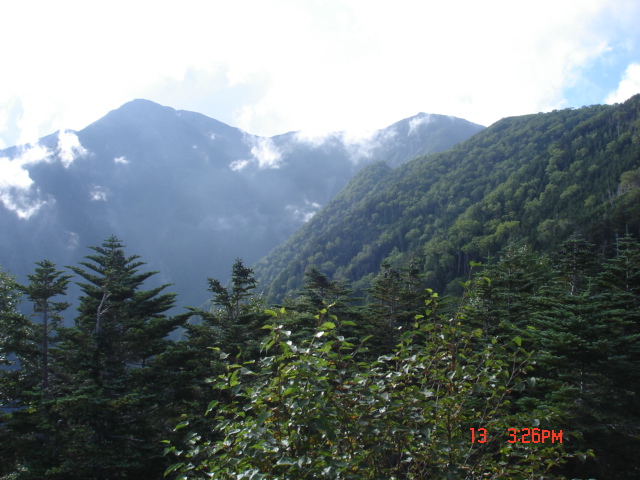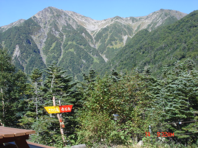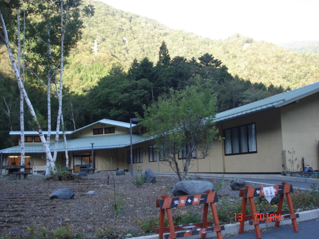 | 私は、家の周りの低山や県内の中級山岳くらいまでは、平気で一人で歩けるが、アルプスや信州百名山の難しい山などは、弟や「山岳巡礼」の根橋さんと一緒に登っている。これは体力的にも精神的にも自信が無いからである。今までアルプスの単独行といったら仙丈岳や立山(雄山〜別山)くらい。それも日帰りであった。今回は単独で行かざるをえなくなり、いつもより不安もあり緊張していた。そんな訳で、麓で一泊した方がいいだろう、とネットで探した畑薙第一ダムの近くにある赤石温泉白樺荘に前夜泊(12日)することにした。 12日は朝、8:30に家を出て、山梨県の国道52号線、静岡県に入り国道1号線静清バイパス、国道362号線で千頭へ、(通常使われるらしい県道27号線は台風の影響で不通)そこから井川を通り、この白樺荘へ午後3:30頃着いた。7時間かかった。 施設は新しく、温泉もきれいだった。床が変わると良く眠れない私だが体は休めることが出来た。12日(月)夜、宿泊者は3名だった。13日朝、出発の前、山の方を見たら、特徴ある山が見えた。後でそれが「茶臼岳」だと分かる。 |