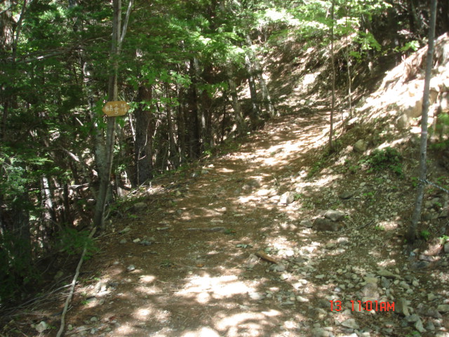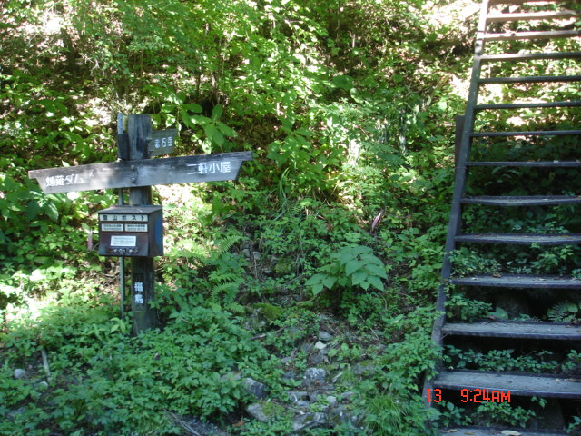 | バスの終点の売店前から、少し斜面を登り返して、道路脇の階段が登山道入り口だ。出発した時間は9:25という事か。この階段の右側に大きな案内板があり、コースタイムが記入されていた。チラッと見ると、5時間以上かかるように書いてあった。家を出る前に山渓データブックを見たらやはり4時間50分。どれも東海フォレストのHP4時間20分より長かったが気にしないでいた。きっとちょっと古い資料で、4時間20分が一番正確なのだろう。植林帯をジグザグに切った道を登りだすと、どんどんと先に登っていった人がいた。もう一人、私と同じゆっくりペースの人がいた。荷物も多そうだ。その人が休んでいたので追い越すと、「きのう車中泊したがよく眠れなくてバテそうだ。」と言う。これはよい同行者ができたとひそかに思って同じくらいなペースで登っていた。 |
