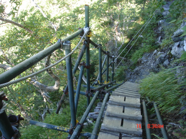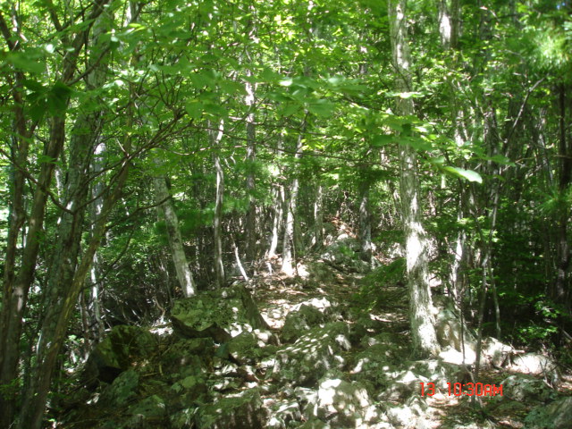 | 富士見平からはちょっと下りになり、岩尾根っぽい場所のトラバース道となっている。これは帰りに撮ったものだが、登る時は、まだ暗いので、ヘッドランプの明かりで注意して慎重に進んだ。桟道があったり、事故も多い、などの情報が昨日見た雑誌や地図にもあったので、一人のせいもあり、緊張して進んでいった。 |