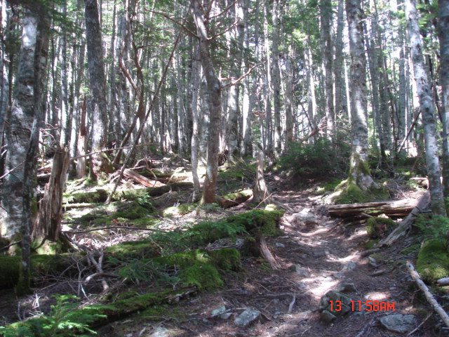 | 針葉樹の植林帯を過ぎると、尾根にのって、山地帯の広葉樹や針葉樹の混じった植生の道になってきた。帰り道に余裕もでき、林なども何となく見ながら下りてきたが、標高2300mより下は、信州百名山の大鹿村の「鬼面山」1889mの植生に良く似ているなあと感じた。今これを書きながら地図を見ると、水平距離15km離れているくらいの同じ緯度にあるので、似ている訳だ、と分かった。 |