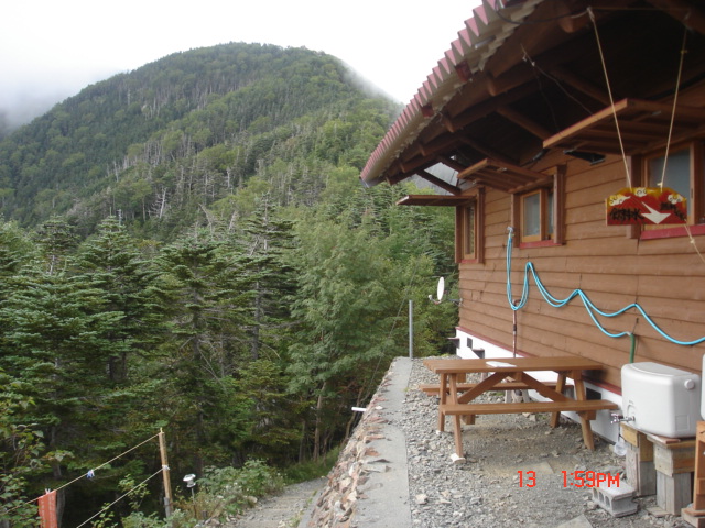 | 自炊小屋(昔皇太子が登った時に泊まった場所と小屋に書いてあった)が現れたと思ったら、直ぐに、赤石小屋に到着した。相当疲れてきたが、それでもバテ切らないうちに小屋まで到着する。休憩も入れて4時間40分くらい。ちょうど東海フォレストのHPのコースタイムくらいなわけだが、体の感じとしては、登り口の看板に書いてあった5時間以上の感じが合っている気がした。夏のこの時間帯に一人で登ったならバテていたと思う。 小屋前で休憩している登山者のご夫婦と挨拶を交わす。受付をして中に入り、言われた場所に荷物を置いた。一つの区画の中に私一人だけだった。結局この日は、赤石小屋全体で7,8人の人が泊まっていただけである。私は、7,8月のアルプスの山小屋しか経験がない。一区画の畳一畳分に1人から2人くらいが詰め込まれ、鰯のかんずめの様になって寝る体験しかないので、本当に新鮮な感じがした。私の寝た部屋にも、もう一人後から来て、その部屋は二人だけであった。もちろん隙間は十分で伸び伸びしている。小屋にある山渓2011年版を見たら、こちら周りのコースと小屋の紹介が書いてあり、小屋の人は若夫婦らしく、アルバイトの若い男性が他に一人いるだけ、お客も私やそれ以上の高年組と学生風の若者一人くらいで、のんびり落ち着いた雰囲気で気を使ってもいただいた。9月など勤めている頃は運動会で忙しいシーズンで、登山など思いもよらない事だ。退職後仕事をしていない事に何か引け目のような物を感じる事もあるが、今回、時間の自由を得たリタイア後の幸せを本当に感じた登山でもあった。 |
