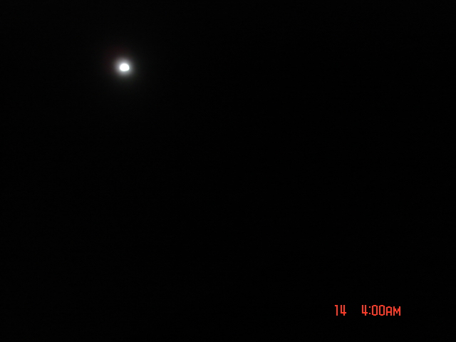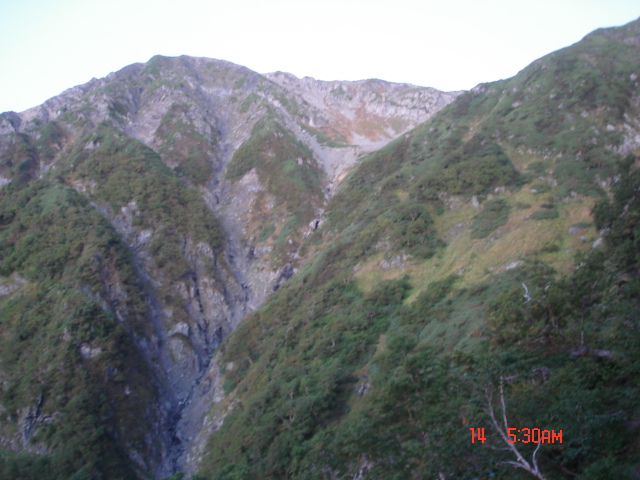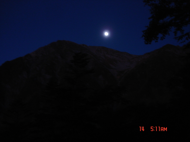 | 5時くらいになると、大分明るさが出てきた。赤石岳に月が沈む所が面白かったので撮ったのだが、ちょうどこれが、出発時の肉眼で見た感じと同じくらいである。実際はもっとはっきりと周囲の景色が浮かび上がってきた。 |