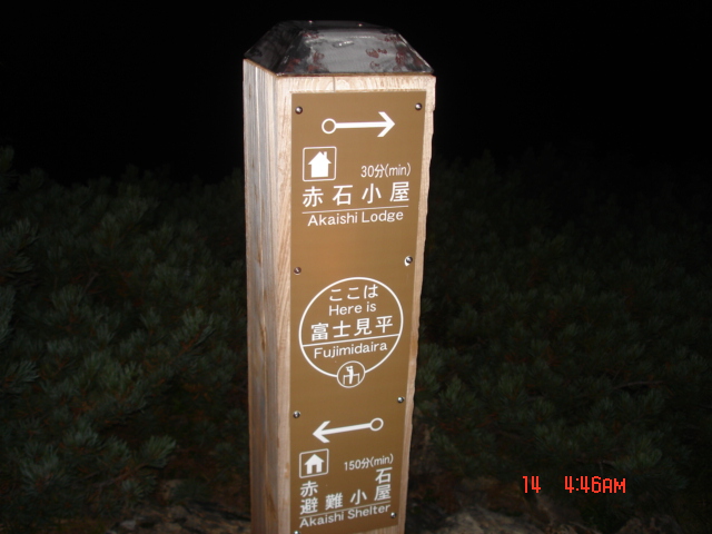 | 富士見平らしい場所に着いた。ハイマツに囲まれた平らな所だ。まだ暗いので、フラッシュモードにして標識を撮った。横に遭難慰霊碑というようなものもあって、ちょっと怖い気分がしたが、帰りに見てみると戦前軍の飛行機が墜落した現場のようで、ちょっと山岳遭難とは雰囲気が違っていた。寒さも無かったので、着ていた雨具をぬいでリュックに入れる。 |