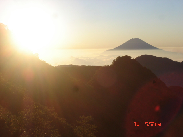 | 振り返ると、太陽が昇ってきた。トラバースしてきた尾根の後に富士山が大きく見える。岩尾根の後が富士見平だから、まさに本当に富士見平だ。 |