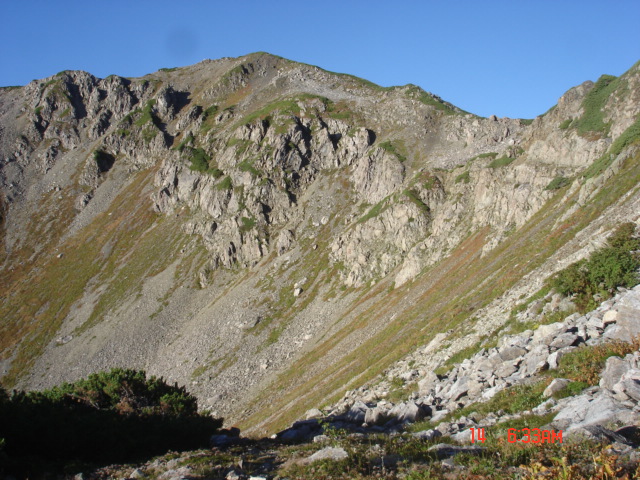 | 富士見平から山頂方面を見る。右側のカール地形へと、沢のこちらから見て右側を登って、途中から中央の尾根状の上部に出て、稜線に出る道だった。 |