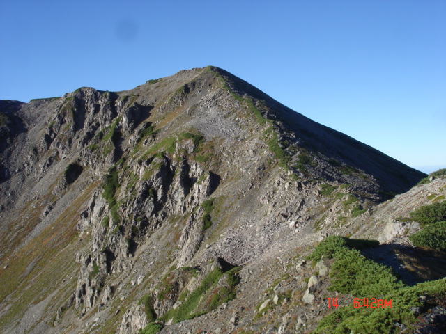 | 尾根に出た。長野県側の眺望、荒川岳へ続く尾根など、良く見える。最後の山頂まで15分という所。黒部五郎岳の山頂へ向かう所を思い出していた。 |