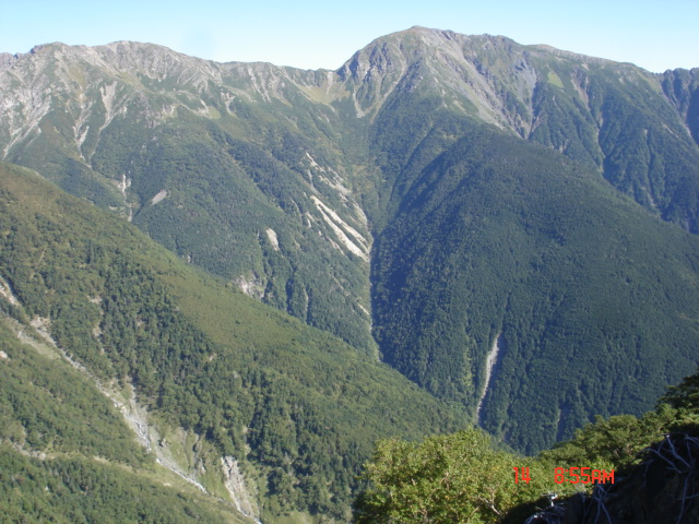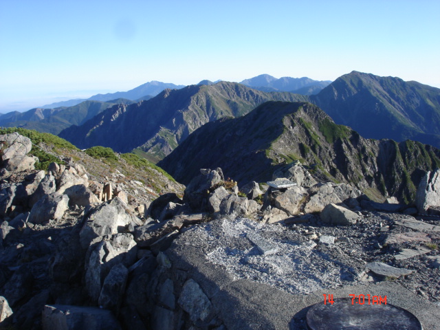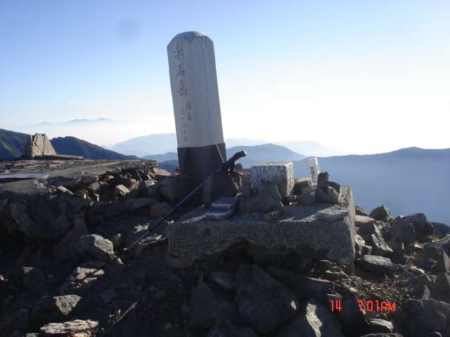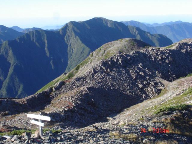 | 山頂に到着。ちょうどコースタイムくらいの時間だろうか。山頂には人は全くいなく、たった一人の山頂だった。兎に角、目的をはたして少しホッとした。でも、まだ2:00までに椹島まで下山しなくてはならない。 |
