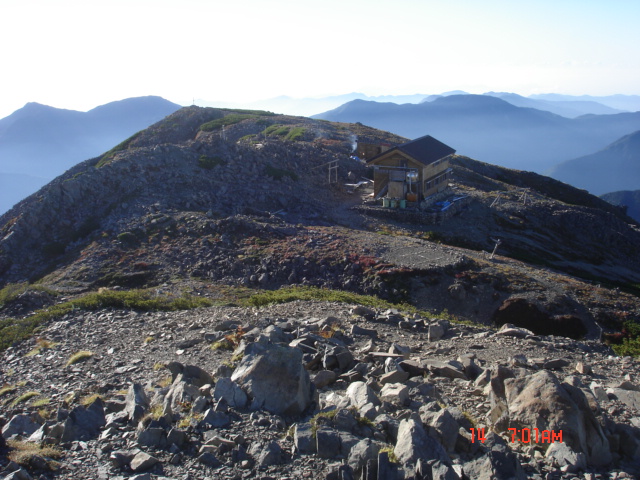 | 兎に角、頂上避難小屋へ行って休む事にした。ここの雰囲気も、以前行った野口五郎岳の小屋付近に似ている。小屋に入ると中年夫婦の小屋番のようだった。、コーヒを頼んで、もって行ったアンパンを食べる。どちらから、と聞かれ、赤石小屋から、と言うと、それは大変でしたね、と言われ、ちょっと気分を良くした。ちょうどドリップコーヒーにパンの朝食という感じで疲れもとれた。トイレにも行ってこれた。帰りの水が心配で、もらえるか聞いてみたら、登ってくる途中のカールへ流れ込む沢水が飲めるとの事。そういえばいかにも美味しそうだった。ピント外れのお願いをしたものだ。小屋の前の鳥居に手を合わせて、帰るためにまた頂上へ戻った。途中2,3羽のイワヒバリが岩に止まっていた。写真に撮ろうとするが間に合わなかった。 |