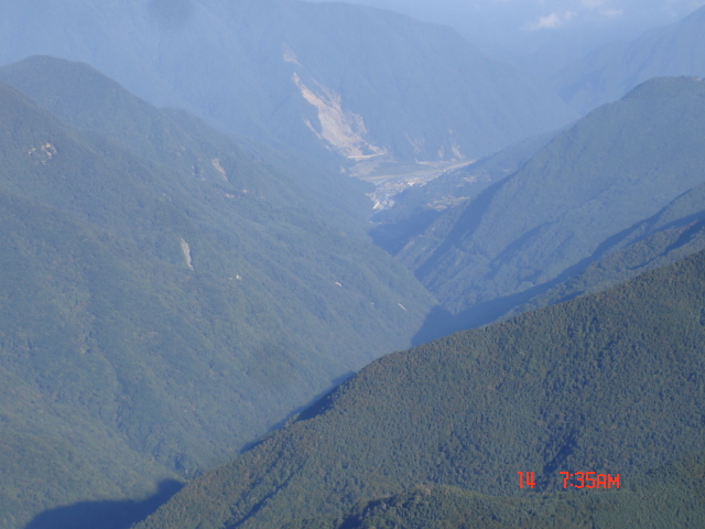 | 赤石岳の西側。長野県側の小渋川は延々と続いていて、大鹿村の大西山崩れの跡?も良く見えた。以前、鬼面山に登った時に、中央構造線博物館近くの橋のあたりから残雪のアルプスを撮った事があった。きっとこの辺が写っているのだろう。 |
