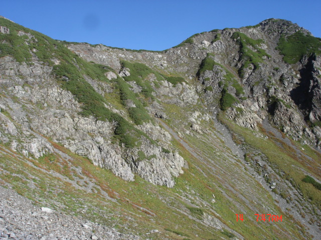 | 小屋の人以外、一人も人に会わない赤石岳山頂部だった。下り始め、ここはカール地形なのかな、と気づき撮った写真。小赤石からこちらの山頂部にかけて、かなり広いカール地形だ。でもかなり風化が進んで、すり鉢状のカーブの感じは弱い。ガイドブックなど色々なものに。こちらの赤石小屋のコースは下山道として軽く扱われているものが多かった。今回も山頂目当ての登山だったが、カールの中を突っ切っていくすばらしいコースだと分かり、思わぬもうけものをした気分だ。 |
