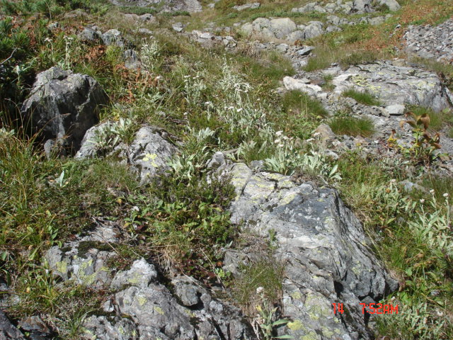 | 高山植物のお花畑は枯れていて、タカネマツムシソウやハハコの仲間がわずかに残っている感じだったが、夏は花も美しい場所になっているのだろう。 |