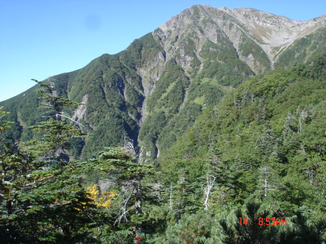 | 登ってきた尾根の上部から流れている沢水を飲んでみた。冷たく美味しい。紅葉もちょっと始まっていたが、紅葉すればきれいな場所だろう。赤石小屋から登ってきた昨日の若者が元気にガンガンと登ってきて挨拶をした。昨日バテた、と言っていた人も全く元気そうに登ってきた。昨晩は良く眠れたのだろう。「もう、下るだけでいいですね。」と言われる。気分的にとても楽になってきた。 |