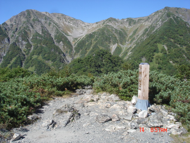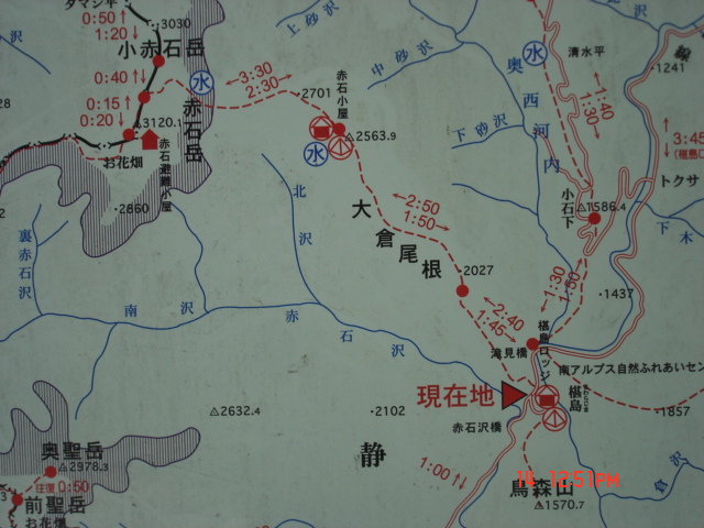 | やっと最後の標識になった。この標識が出てくるあたりから、次第に高山帯の岩稜的な部分も出てきて、小屋の手前の尾根上の2563mの三角点ピークを目指して登っている事が分かる。岩の隙間には亜高山植物の花畑があったように感じられる場所もあったが、サラシナショウマ?がポツポツ咲いている程度だ。登りきった感じのピーク状の地点にあった小屋まで30分という標識からは特にもう直ぐ、と思うせいか、まだかいな、といった感じがした。これを作りながら写真の時間を確認すると、この標識はゆっくり登った時の約1時間位の間隔を目途に作られているのだ。最初からその事をパッと分かって意識して登っていれば、標識は、まだ出てこないな、などとあせらなくてすんだのだ。やはりオレは計算が出来ない人だ。 |