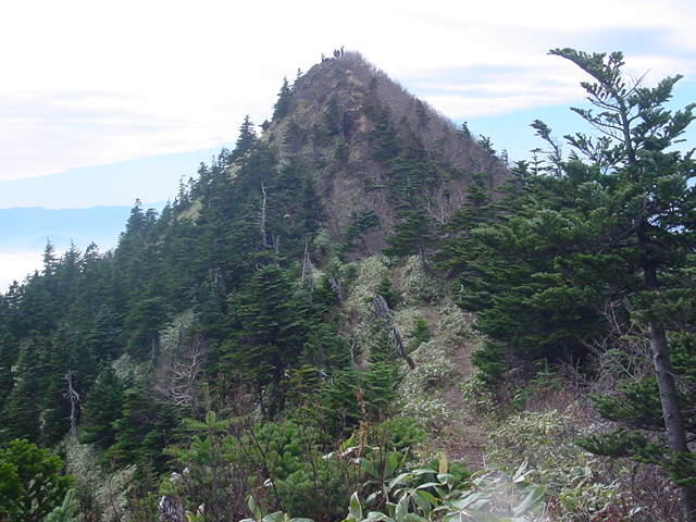 三角点のある場所から,祠のある山頂を見たところ。三角点の方が標高は低いです。この日,山頂は大勢の人でにぎわっていましたが,