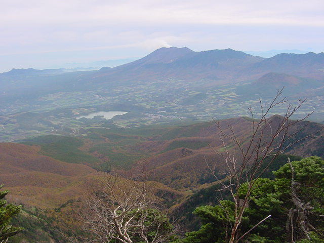 三角点付近から浅間山の方を見た所。噴煙を上げています。下の湖は,田代湖。(2004,10,16)
