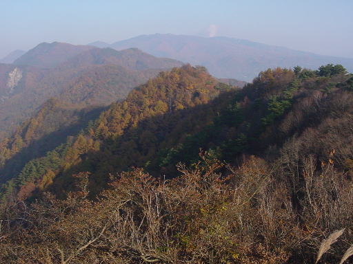 | 鳴海さんと別れ,三角点峰まで行く。遠く,煙を吐く浅間山が見え,太郎山までの尾根が見えます。右には上田市,左には西尾根を長く伸ばした大峰山が見えます。3時20分になっていました。日も傾いて日陰が増えてきました。いそいで下る事にしました。また暗い北斜面でバラに刺されるのはいやなので,西尾根を回って下る事にする。 |