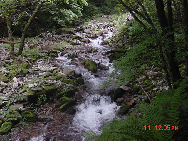 | 沢をわたってしばらく行くと,滝に着きます。こしかけてちょっとした物を口に入れました。沢筋よりさらに涼しく,涼風が吹き渡っていました。 |