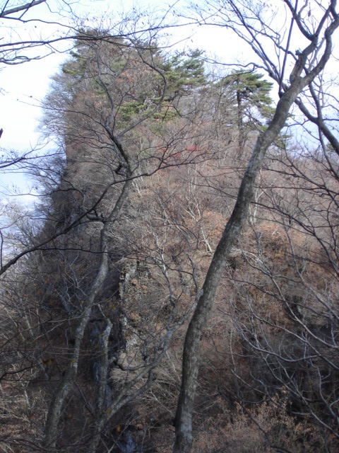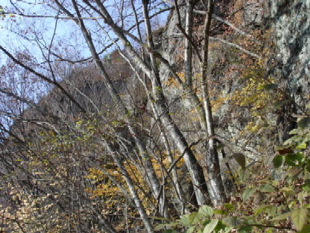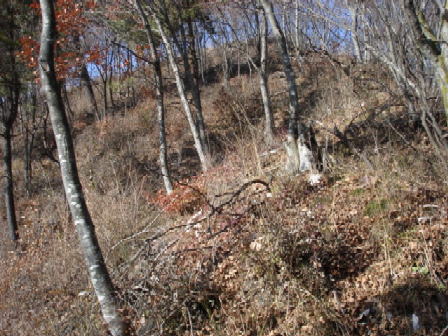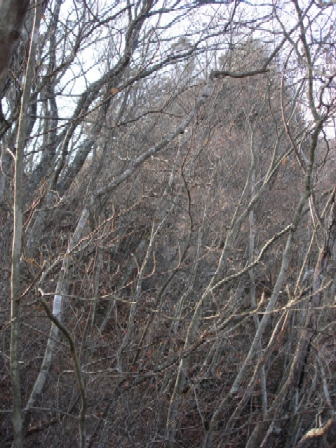 しばらく行くと、岩稜の登りとなり、尾根に出ると行く手に塩田側に崖となった峰が見えてきた。葉が落ちたので、今日はっきりとその崖が見えた。その時ちょっと下の方で大きな獣が駆け下りる音が聞こえた。熊かなと不安になったが、しばらくすると下でカモシカの鳴き声のようなものが聞こえたので、カモシカと思う。 |