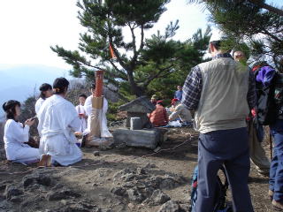 足が重くなったが、12:08山頂着。今まで一人も人に会わなかったのに、山頂には10人以上の人がいた。白い服装をした人達がいて読経していたのには驚いた。若い男女と年配の女性。ロープで祠と自分達を囲って声を合わせて読経していて、山頂は異様な雰囲気に包まれていた。オーム真理教の再来か?と驚く。すぐ下山しようと思ったが、ちょっと興味があったので、白衣の集団を観察する事にきめ、お昼用に持ってきたコンビニのサンドを食べていると、読経が終わり、その人達はにこやかに記念写真など撮り出したので、少しホッとする。下山する前にちょっとその内の一人に聞いてみると、修験道を勉強しています.と言っていました。見ると、かぶる物から履物まで、本格的修験道のスタイルでした。ホラガイを持っていたので、吹いてくれないかなと思い,それも吹くんですかと聞いたが、ええ,とにこやかに答えただけで、吹いてみましょうか、と言わなかったので残念でした。12:20下山。12:55平井寺登山口。それから延々と林道、車道などを歩いて、出発点の車に戻ったのは2:05でした。 |