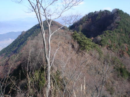 東尾根の最後の部分(平井寺コースとの尾根合体部分)の一つ手前のピークを、少し登って平井寺コース登山道の方から撮ったもの。絶壁は塩田側に落ち込んでいることが分かる。 |