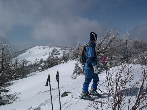 | 三方ケ峰へは、さらに尾根を進まないといけないが、シールをはずしてここから引き返す。 締まった雪に粉雪が多少積もった状態で、滑りやすく気持ちが良い。池の平周辺は色々自由にコースがとれると思う。 リフト終点まですぐ着いてしまう湯の丸スキー場からの手ごろな小ツアーです。(2005、2,12) |