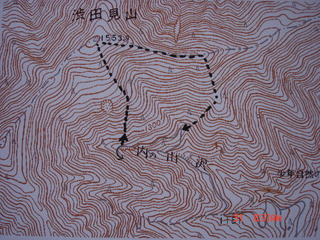 「山岳巡礼」の根橋平良さんと、春休み中に渋田見山に登る約束をしていた。前日、冬型の気圧配置に逆戻りし、少し緩んだら、また低気圧が近づいてくるという悪天候、しかし前々からの予定で、この日しかない。 幸い、朝のうちは天候が持ちそう。しかも渋田見山は大分前だが一回登っている。標高も、標高差もそれほど無いし、根橋さんと二人だ、大丈夫だろうと出発。 根橋さんの四駈車で、内の山林道を登る。悪路をしばらく登り、雪がかなり出てきて、車を置いて出発。 以前登った時は、林道の下の方に車を置いてきたせいや、その後林道も上まで伸びたようで、かっての雰囲気が無く、登り口の広い所が見当たらなくて通り過ぎてしまっていた。(その場所は変わっていたのが、下山時に分かった。) ちょっと、行き過ぎたのかな、と思う場所まで林道を上る。林道はまだ続いている。右手に尾根が張り出して、そこが小さい沢になっている。 天候も悪化のきざしで、簡単に登り口まで案内できると思っていた思惑がはずれて、少しあせってきた。「どうもおかしいです。こっちの尾根のこの辺に来ちゃったんではないかな?もどりますか。」私は現在地が左の地図で、破線の道の先端あたりのような気がして、根橋さんに地図を示すと、「大分車で登りましたよね。目の前のこの尾根を登ってみましょう。そうすれば分かるかもしれない。」 そこで、根橋さんについて、沢にそった踏み跡を少し登り、すぐに、尾根に向かって急斜面を登りだす。雪は無く手は使わなくてもよいくらいの斜面で、けもの道が交差し、落葉樹が点点としてる。晴れていれば気持ちがよい位の斜面だ。 しばらく登ると、幹の皮が大きく剥がれている木が現れる。「これはシカですかね。」などと話しながら登る。 私は、現在地が地図上の内の山沢の南の尾根の南斜面を歩いているような気持ちで登り続ける。 |