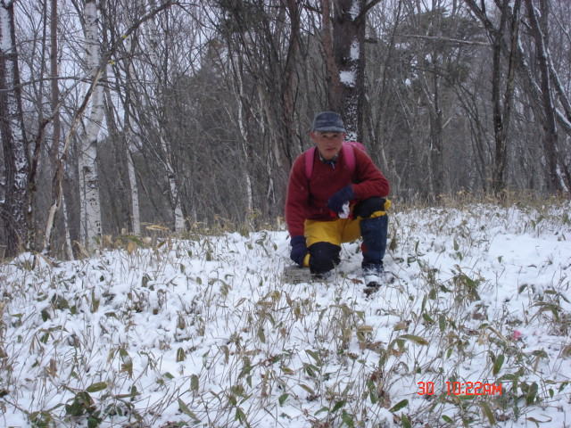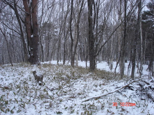 しだいに傾斜がゆるまり、下草が笹になる。いかにもシカが歩き回っているような地帯に出た。まだ雪は降り出さないが、稜線が何となく雪雲でかすんできて見通しがつかなくなりつつあった。 根橋さんは、帰りの方向を見失わないように慎重に赤布をつけている。晴れていればどうという事はないと思われるが、この時点では、本当にちょっと心配な気分だった。 稜線の方を見たが、どうも様子が変だ。木々の間から、左手に雪の積もった緩斜面の雪原が見えた。地図を見直すと、1300と書いてあるところも、尾根だと気付いた。もしかしたらここを登っているのかもしれない。 斜面はゆるく、いかにもピークへと向かうような踏み跡もある。もしかしたら上手くいったのかもしれない。 始めは半信半疑だったが、三角点を発見し、その突き上げた所が広々とした頂上だった。頂上部分は浅い雪に覆われていた。(写真は根橋さん) 1300mの等高線の尾根なら、標高差が300m位だから、このくらいの登りで到着して当然だ。 さっきから、笹の葉がシカに食べられたのか、山頂部一帯の笹の葉が無くなっているのに気付く。 木の幹が剥がされているものもあり、シカが増えすぎていて。シカ害などが始まらなければいいが,と思う。 雪雲で霞んでいて、樹間から見えるはずの展望は全く無い。 |
