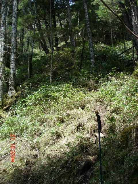 | その工事のための地帯をすぎ、しばらく苔むした沢状の場所を登ると、何となく細い山道の跡が現れた。それも消えそうになったりして、シカの糞?だらけのけもの道の交錯する地帯を、ティッシュの目印をつけながら、慎重に道形をひろっていくと、しだいに上の雰囲気が出てきて間もなく尾根に出た。 |