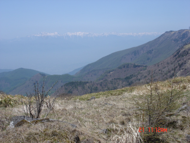 | 尾根に出る手前にほんの少し残雪が残っていた。東側への道の降り口は、道形がかすかに残っているかな?程度で、道標も無く、バス停へ向かってここを降りる一般登山者はいないだろうと思われた。美ヶ原の尾根に出たとき、人もほとんどいなく、樹林帯から広大な台上に出て気分が開放されるようだった。 「水色の天に霞むや穂高岳」 |