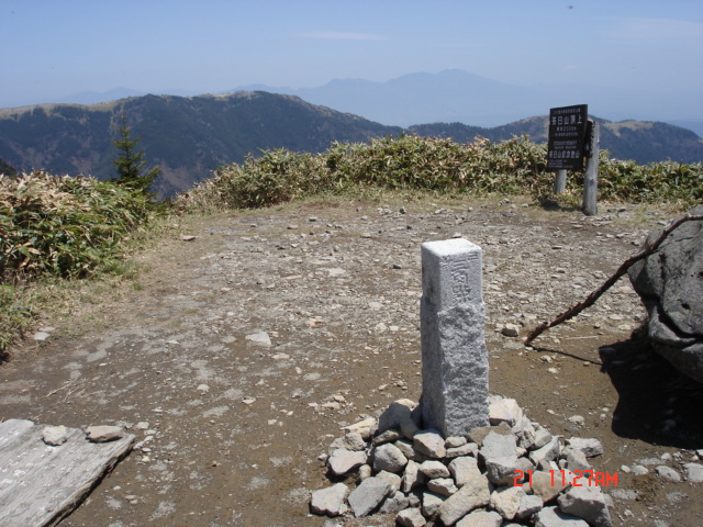 | 茶臼山頂上には3等三角点があった。もちろん、八ヶ岳方面から御岳の方まで、展望が広がっていた。登山者が一人挨拶をして下りていった。山頂から少し離れた西側に中高年登山者の大グループが昼食中だったので、そそくさと休憩して下山する。 |