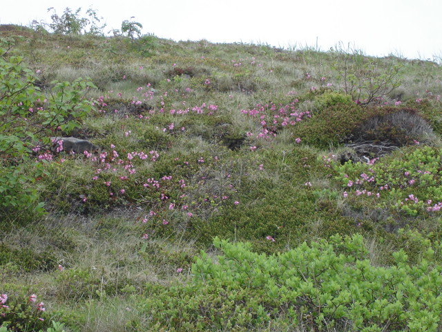 | 小四阿山の中尾根コースもよく整備され、また最後まで花がありました。下の方は、レンゲツツジと白樺の取り合わせがいいです。 |